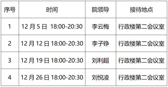 根据学院《院领导接待日管理办法》,现将2023年12月院领导接待日安排通知如下: