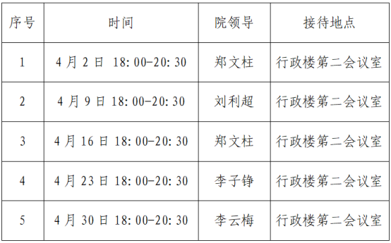 根据学院《院领导接待日管理办法》,现将2024年4月院领导接待日安排通知如下: