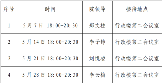 根据学院《院领导接待日管理办法》,现将2024年5月院领导接待日安排通知如下: