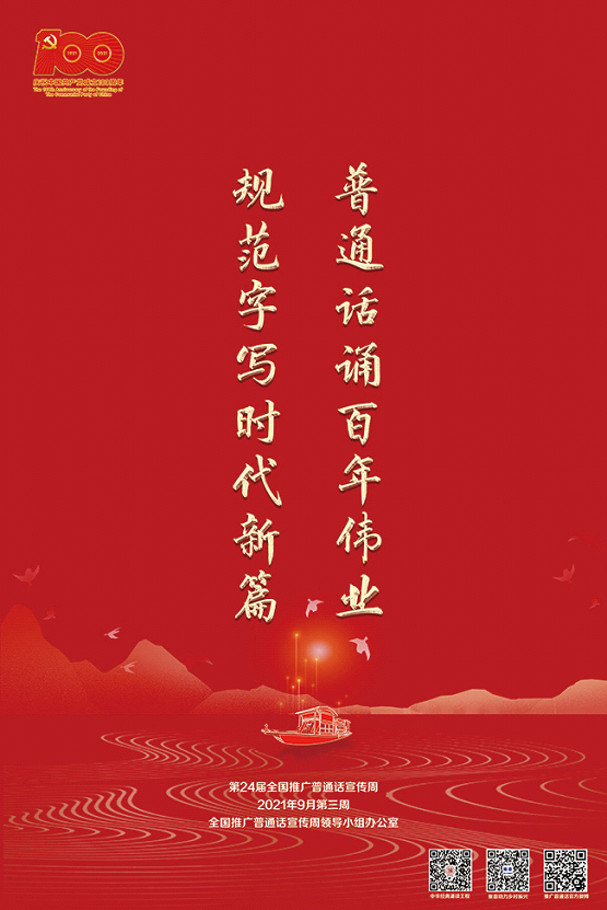 海报一,以“普通话诵百年伟业 规范字写时代新篇”为设计思路,背景为中共一大会址浙江嘉兴南湖,体现在党的坚强领导下语言文字事业百年光辉历程。